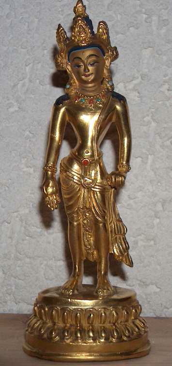 Selten ist seine Kopfkrone mit dem Buddha Amitabha gekrönt, als dessen geistiger Sohn wird er auch verstanden. Dadurch ist diese komplett feuervergoldete Kupferstatue mit Kaltgold bemaltem Gesicht etwas besonders.