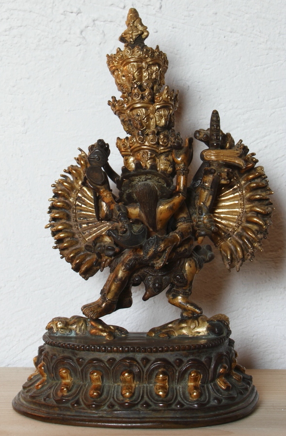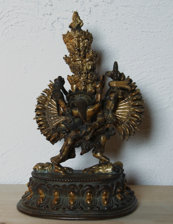 Der Sadhita - Hevajra (Heruka) ist 20 cm hoch und ist teilweise feuervergoldet und hat ein antikes finished. Durch Rituale soll das Absolute (Vajra) erlebnishaft gegenwätig werden, durch die Silbe he soll das Absolute angerufen werden.