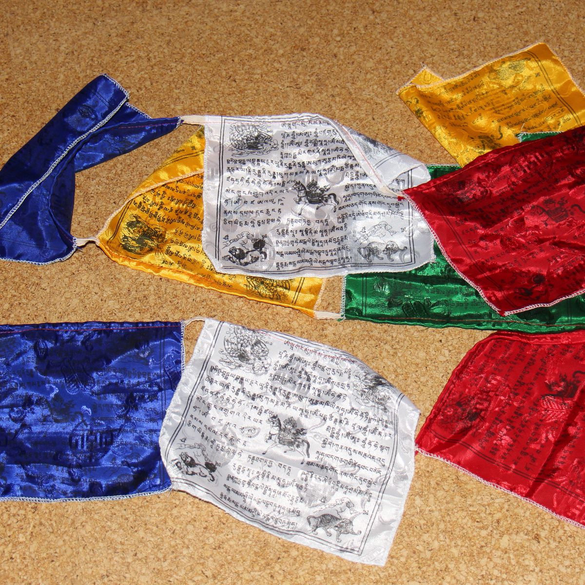 Die Gebetsfahnen sind aus Seide hergestellt, Es sind 10 Fahnen in 5 verschiedenen Farben. Eine Gebetsfahne ist 22cm breit und 17 cm hoch, alle 10 Fahnen sind ca.250 cm breit.