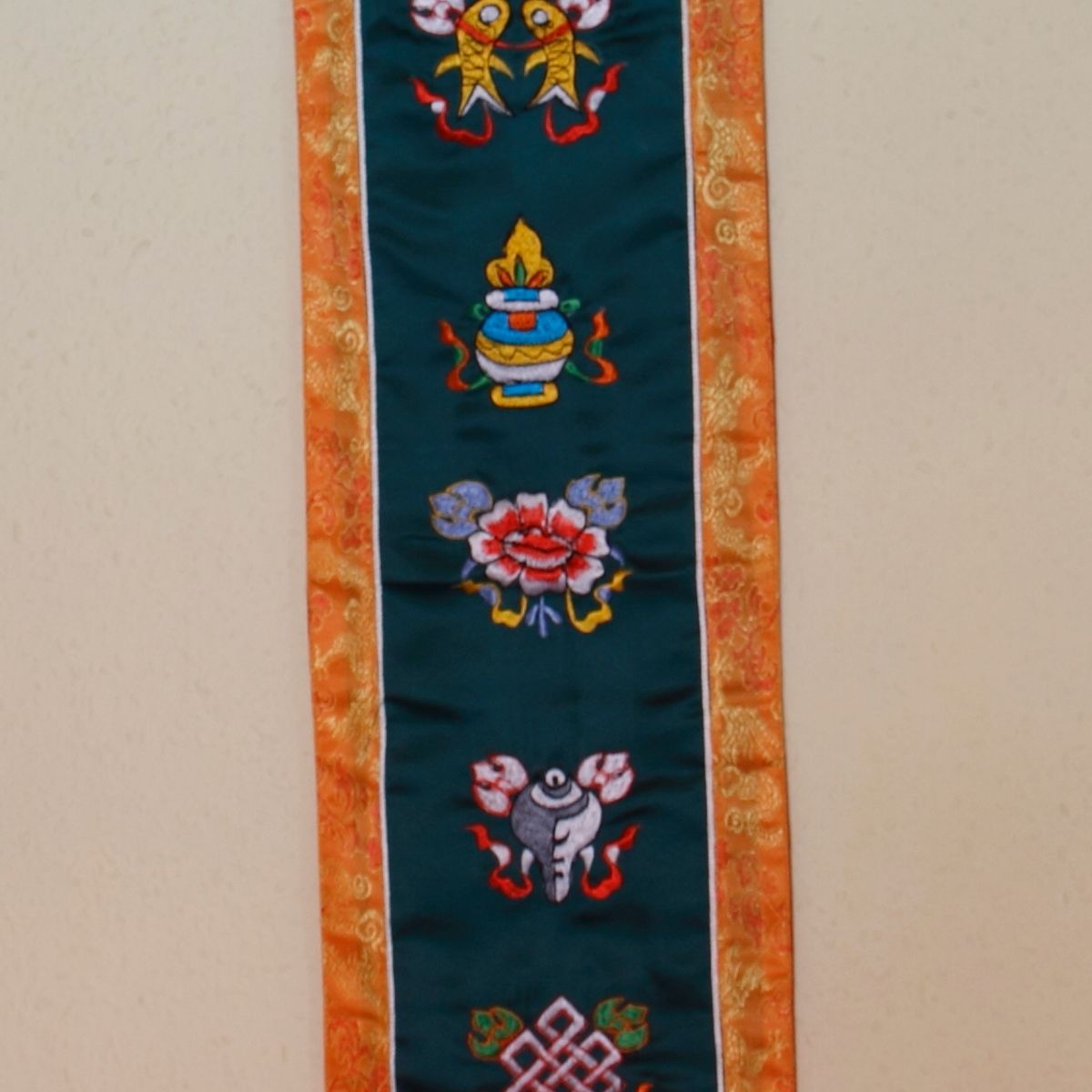 Wandbehang Stoffteil 20 cm breit 109 cm lang mit den 8 Schriftzeichen des Mantras Om Mani Padme Hum.